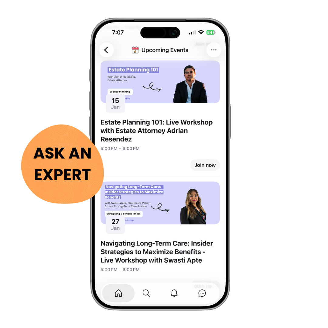Get answers directly from the professionals who know these topics inside and out. Our workshops bring in estate lawyers, grief counselors, benefits experts, death doulas, financial advisors, and more to break down important topics and answer your questions live.